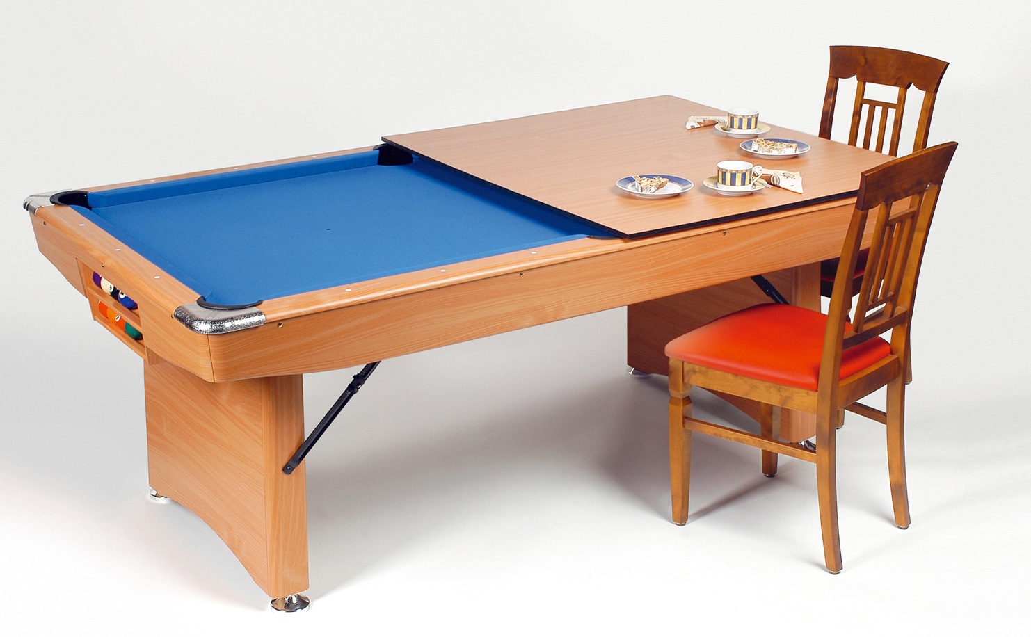 Das Modell London ist ein äußerst formschöner und praktischer Billardtisch. Seine Oberfläche in Buche-Dekor sowie das blaue Qualitätstuch sind pflegeleicht und unempfindlich. Die Spielplatte besteht aus feuchtigkeitsunempfindlichem Werkstoff. Die beiden stabilen Balkenfüße sind höhenverstellbar und durch eine einklappbare Metallstrebe in kürzester Zeit platzsparend zusammen zu klappen. Das Modell London ist mit Balleinfalltaschen ausgestattet. Zur Ablage der Kugeln ist ein Fach auf der Stirnseite integriert. Für beide lieferbaren Größen 5 ft und 6,5 ft ist eine passende 2-teilige Abdeckplatte „als Option“ erhältlich.
